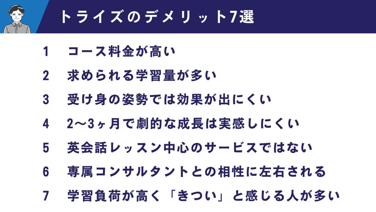 トライズの学習プログラムそのものは非常に優れている一方、その前提条件と合わない人が受講するとデメリットを感じてしまう恐れがあります。